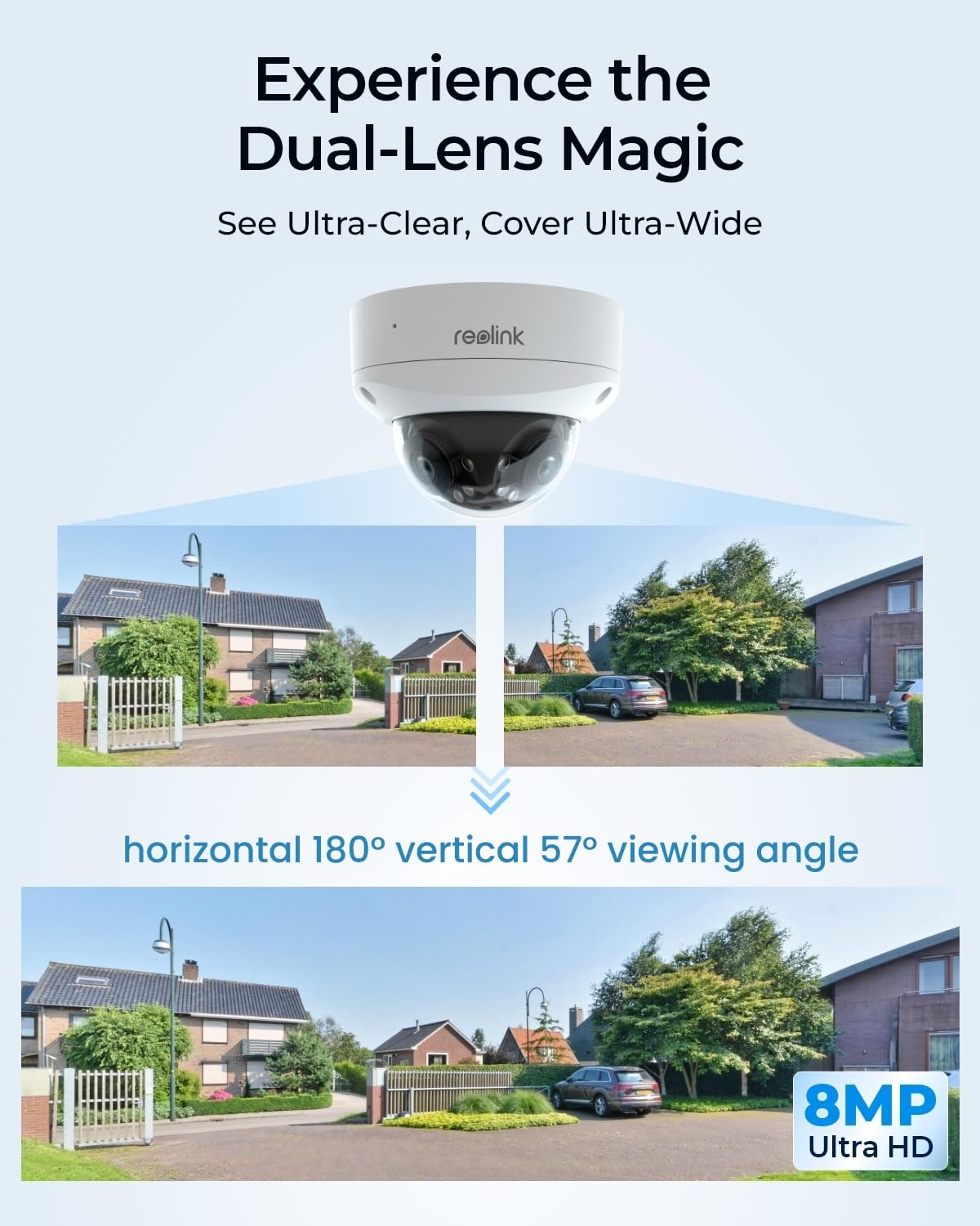 REOLINK 4K 8MP 180° Dual-Lens PoE IP Camera, IK10 Vandal-Proof, Person/Vehicle/Animal Detection, 8X Duo 2V PoE with 1x RLN16-410 (Built-in 4TB HDD) Video Recorder