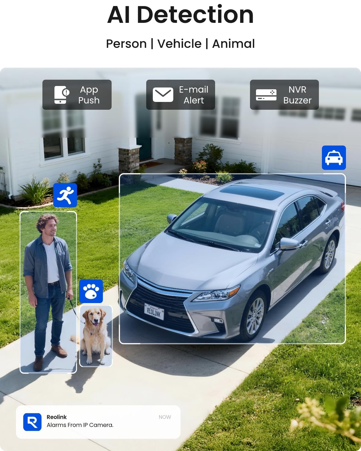 - SMART PERSON/ANIAL/VEHICLE DETECTION – Smart PoE IP cameras can identify people, animal and vehicles while minimizing unwanted alerts such as animals or shadows. This home security camera system can also be configured to specify the type of detection when sending alerts to you. Know what happened simply by glancing at the lock screen.