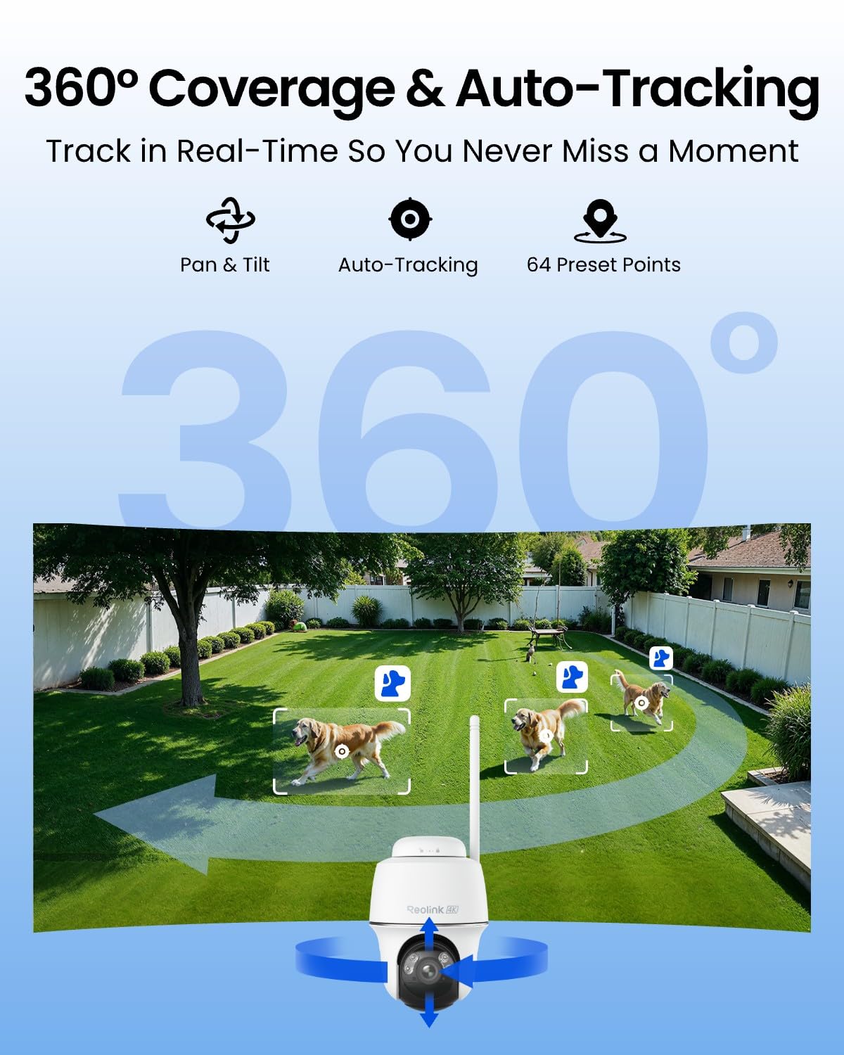 REOLINK First 4K Solar Security Cameras Wireless Outdoor, Argus PT Ultra+Solar Panel, 360° Pan Tilt Auto-Tracking, 8MP Color Night Vision, 2.4/5 GHz Wi-Fi 6, No Subscriptions, Home Hub Compatible
