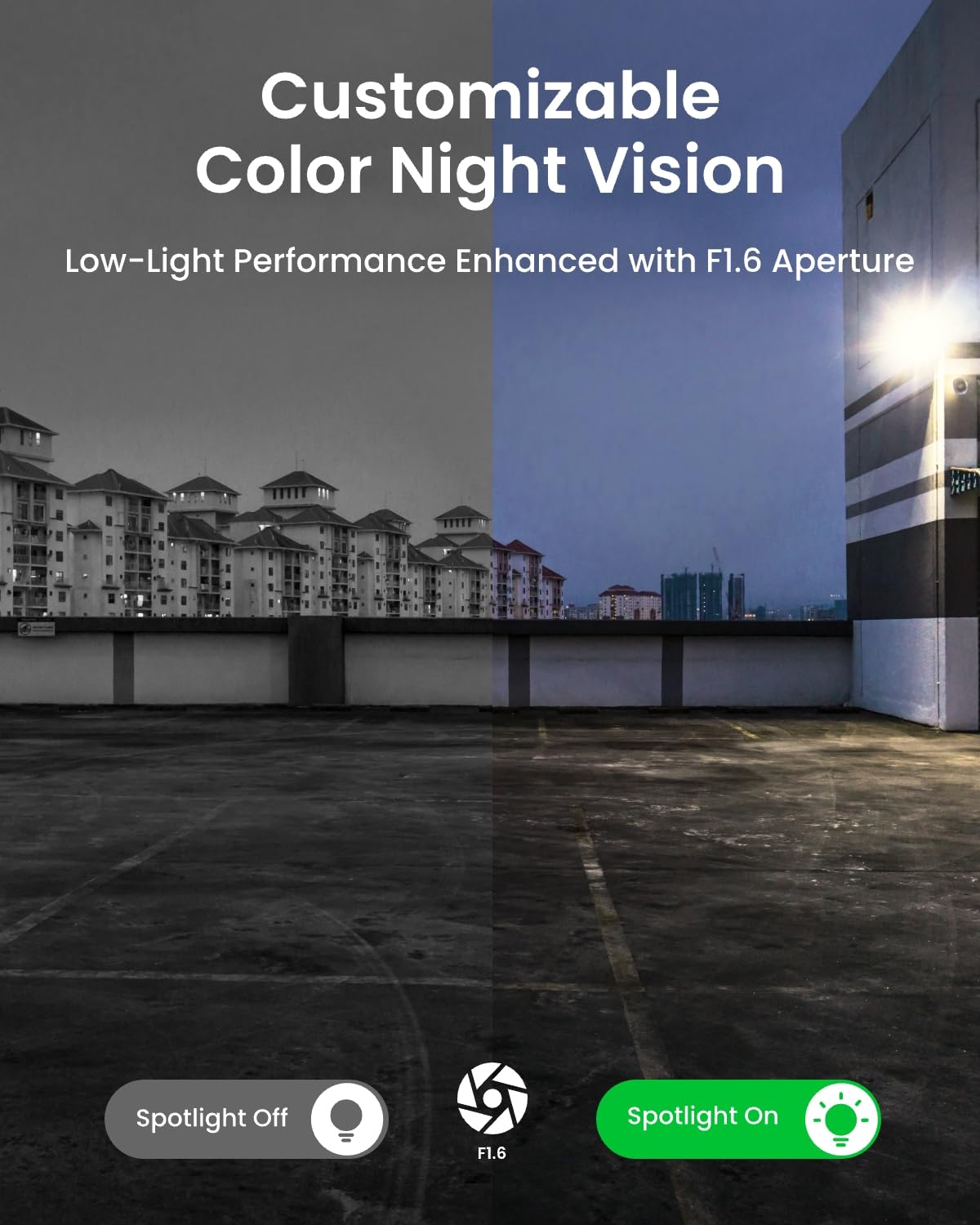 - CUSTOMIZABLE COLOR NIGHT VISION: By switching on/off the smart mode for color night vision, you can set the spotlights to activate either on detection or to remain always on. The F1.6 aperture delivers clearer, brighter nighttime footage in low-light conditions.