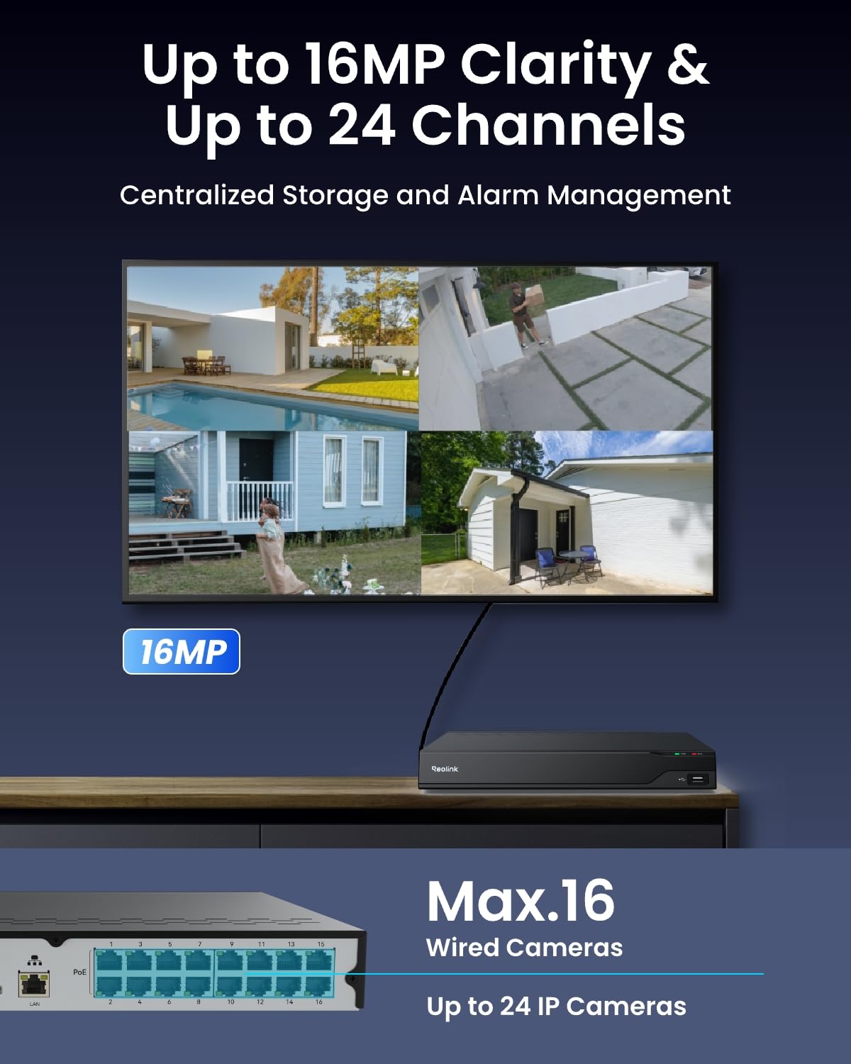 - 16 PoE Ports & Up to 24 Camera Channels: Experience central storage and alarm management for various Reolink cameras. Supporting up to 24 channels, build a security system all with battery Wi-Fi cameras, or with 16 PoE or plug-in Wi-Fi cameras and additional 8 battery Wi-Fi cameras.