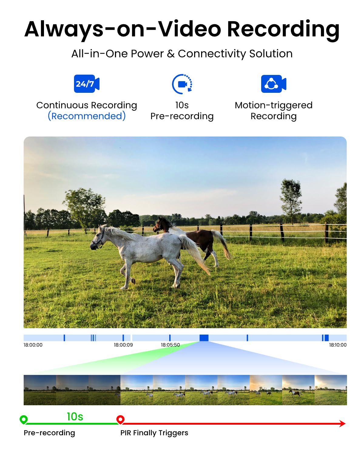 - 24/7 Recording, 512GB Large Storage: Supports three recording modes: continuous, motion-triggered, and 10s pre-recording—powered by Always-on-Video technology. Pair with a 512GB microSD card (not included) to store more footage over time, ensuring round-the-clock surveillance with no extra fees.
